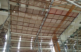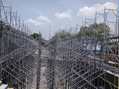 時下最常見的建築鷹架,適用性廣泛,為目前營造業最常使用之鷹架。 鋼管鷹架-利用萬向活扣將鋼管組合而成之施工架,可塑性高,已逐漸取代傳統竹架。